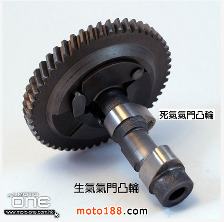 ●以這臺(tái)單汽缸引擎來說,除了原有頂開進(jìn)氣氣門及死氣氣門外的凸輪外,在曲軸上還增加較高角度的進(jìn)氣凸輪,以增加進(jìn)氣氣門升程,在高轉(zhuǎn)時(shí)吸入更多空氣,死氣氣門則不受影響。引擎采用單凸輪軸4汽門及叉型搖臂式設(shè)計(jì)。
