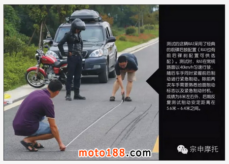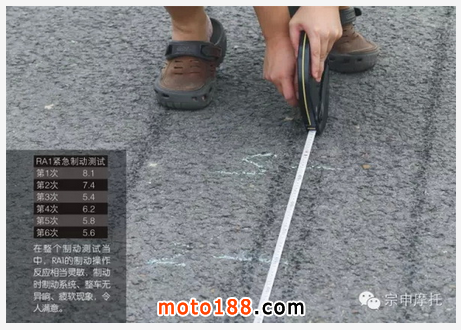 RA1采用了經(jīng)典的前碟后鼓配置(RA1也有前后碟剎配置可供選配)。測試時(shí),RA1在常規(guī)路面以40km/h勻速行駛,車手在測試中同時(shí)緊握前后制動(dòng)進(jìn)行緊急制動(dòng)。除前兩次車手需要熟悉地面制動(dòng)標(biāo)志以及緊急制動(dòng)時(shí)機(jī),成績?yōu)?米左右外,后期反復(fù)測試制動(dòng)安定距離在5.6米~6.4米之間。