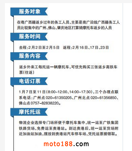 每年春運,我市都會出現浩浩蕩蕩的摩托車返鄉大軍,在返鄉途中經常面臨各種安全隱患。昨天,廣鐵集團公布了“為廣西籍異地務工人員乘坐高鐵、托運摩托車返鄉提供便利服務”方案,活動服務對象包括在粵務工廣西籍返鄉過年的務工人員,主要是南廣沿線廣西籍務工人員比較集中的廣州、佛山、肇慶地區打算騎摩托車返鄉的人員。廣東物流企業等將提供免費托運摩托車捐助服務,托運區間為廣州、佛山至貴港。