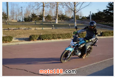 騎上車第一個動作就是以往最難的倒車,首先感覺130kg的車重真的很輕,即使不能雙腳掌全面著地,但倒車調頭仍然毫不費力。道路駕駛中車身靈活好操控,低扭比較大,怠速很高,檔位清晰,尤其是二檔降空擋時很好找一踩就到。雖然沒有ABS,但在急剎輪胎抱死時,由于車輕易操控,所以感覺仍可以在控制之中,這種安全感還是第一次有。