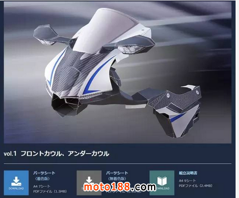 為方便大家下載及分門別類,廠方把車身分為5個單元,分別是包圍、轉向系統及油缸引擎、車架及前后輪,每個單元分別有彩色版、黑白版及折紙技巧說明書。愿意嘗試的小伙伴就拿走吧,雅馬哈君等你的好消息!