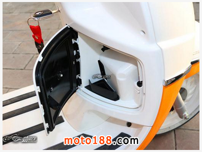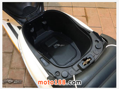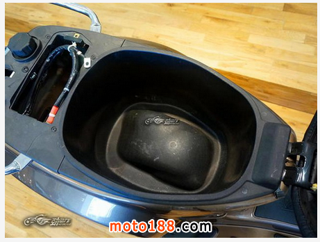 “姜戈”也有放置隨身物品的儲物格,其中也配有12V點煙器接口,并可以通過鑰匙在點火開關位置鎖閉。里面的小隔斷是專門為了放置手機的,顯得非常貼心,只是它的空間要比LX150的小了很多。