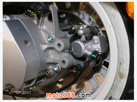 單鉆孔盤配合對向雙活塞卡鉗,對于這樣一輛150毫升排量的小踏板來說,已是綽綽有余了。