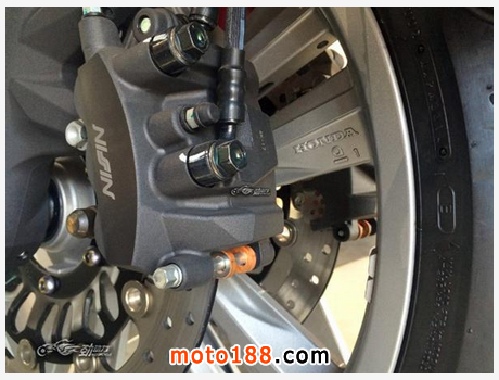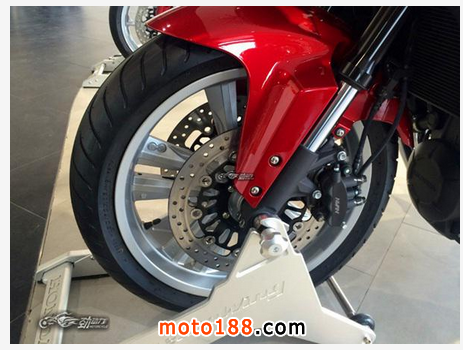 車輛采用了做工十分精致的鋁合金輪轂,不過造型上沒有什么亮點。前輪采用雙鉆孔盤配合單向3活塞卡鉗,后輪采用的是單鉆孔盤配合單向雙活塞卡鉗。制動系統的配置還是不錯的。