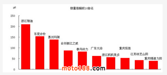 銷量漲幅前10排名中,浙江雅迪以209%的漲幅位居榜首,在如今的市場中獲得超過兩倍的漲幅,實屬不易。上榜知名企業分別有東莞臺鈴、春風動力、廣東大冶等,漲幅均超過33%。