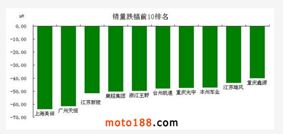 銷量前10排名中,除五羊-本田外,均出現下滑,幅度最大的是洛陽北方易初,由956066臺下滑至710580臺,同比下滑25%;五羊-本田由1062288臺上升至1069104臺,微增0.64%。
