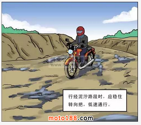 (6)行經泥濘路段時,應選用適當擋位,保持足夠的動力,穩(wěn)住轉向把,均勻一次性通過。通過長泥濘路段時,應中途停車熄火休息,以防止發(fā)動機溫度過高。通過泥濘路段時,應停止加油,必要時下車推離泥濘路段,否則車輛會陷入泥潭,不斷打滑。