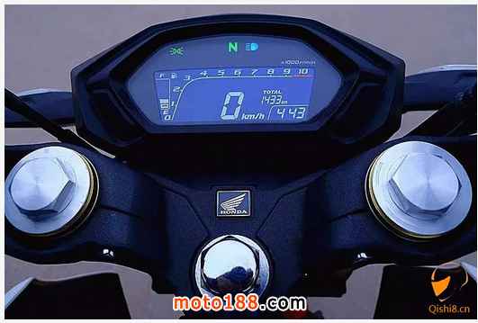 全數(shù)字顯示的集成儀表也是此車的一大亮點(diǎn)是從CB500F上直接“移植”過(guò)來(lái)的,這等頗高的配置甚至在進(jìn)口大貿(mào)的CB300F上都沒(méi)有配置(可想本田已經(jīng)在看重國(guó)內(nèi)市場(chǎng))顯示醒目、直觀、沒(méi)有多余的顯示,唯一遺憾的就是沒(méi)有配備檔位顯示,這可能對(duì)新手來(lái)說(shuō)上手稍微有些吃力了。 細(xì)節(jié)部分,在儀表的兩側(cè)本田也很細(xì)心的采用了仿碳纖維材質(zhì)的外殼,細(xì)節(jié)上很讓人滿意! 采用分離式車把的街車著實(shí)不多而CBF190R算一個(gè),騎士可以通過(guò)調(diào)節(jié)車把兩端的螺栓來(lái)調(diào)節(jié)適合自己的車把高度和方向。正中心的Honda的logo恰到好處的點(diǎn)綴,配合車把比較細(xì)膩的做工,給騎乘者們帶來(lái)非常不錯(cuò)的視覺(jué)感官體驗(yàn)。 全LED的概念在190上得到了很好的體現(xiàn)就連車把的按鈕指示燈也不例外,它也是現(xiàn)目前唯一的國(guó)產(chǎn)車上配備此功能的車型。尤其是在夜晚騎行時(shí)儀表盤(pán)的背景燈和車把背景燈相呼應(yīng),整車逼格提升N個(gè)檔次。各功能的大按鍵讓你使用起來(lái)也得心應(yīng)手,分布合理! 油箱造型絕對(duì)算得上驚艷,棱角分明的油箱向下延伸直接和前翼板融為一體后現(xiàn)代感十足!同樣也得騎士充分的腿部空間。為了美觀Honda的那位美女設(shè)計(jì)師還為它在油箱兩邊設(shè)計(jì)了假通風(fēng)口,至少在美觀的角度上來(lái)說(shuō)這沒(méi)錯(cuò),您說(shuō)沒(méi)錯(cuò)吧?個(gè)人感覺(jué)唯一的缺點(diǎn)就是當(dāng)你真的跨上這臺(tái)車時(shí),你總會(huì)覺(jué)著油箱整體著實(shí)小了一號(hào),不過(guò)這會(huì)體現(xiàn)出他的另一面——靈活 一體式的車座采用紅色的縫線鏈接,運(yùn)功感十足!主駕駛座和副座較高的落差似的這臺(tái)車的“屁股”能夠高高翹起顯得整車非常的戰(zhàn)斗。車座的乘坐舒適度適中,并沒(méi)有像藍(lán)寶龍300那種坐下去就陷下去的感覺(jué),但是也沒(méi)有那種像防賽那樣硬邦邦的感覺(jué),更夠很好的襯托我想這就是最符合街車定義的吧 最后來(lái)到車尾燈這,我們看到的依然是各種的LED,不過(guò)這塊尾燈上的塑料外殼確實(shí)不夠顯檔次,和整車的珍珠漆面外殼很是不搭,在下方設(shè)有隱藏式的把手,方便一旦發(fā)生意外倒車扶車使用。