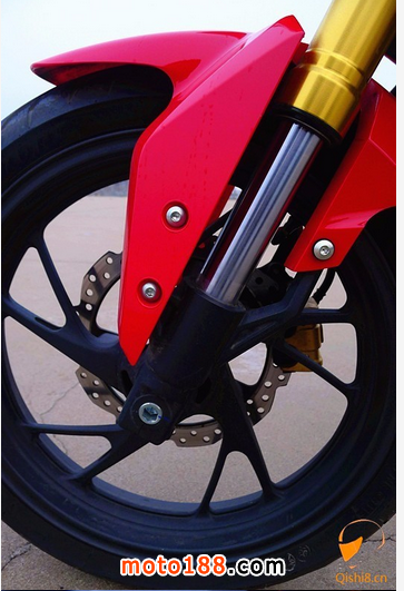 黃金色的倒置前叉加上單盤(pán)雙活塞的剎車卡鉗配置絕對(duì)厚道,調(diào)教一流的前懸掛配備110/70-17的前輪。本田對(duì)它的調(diào)教能給你提供較強(qiáng)操控力能力的同時(shí),剎車能力也是同級(jí)別里數(shù)一數(shù)二。