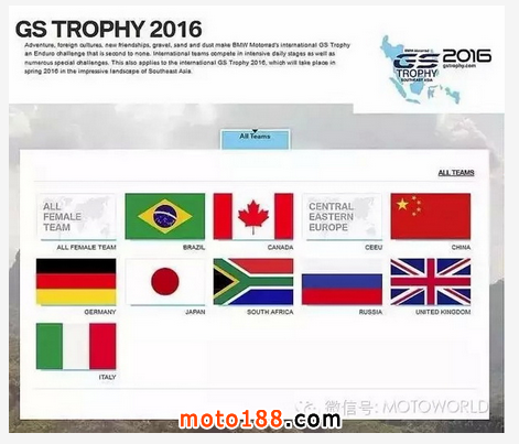 有“BMW Motorrad 世界杯”之稱的國際BMW Motorrad GS Trophy挑戰(zhàn)賽將于2016 年 2 月 28 日到 3 月 5 日在泰國清邁拉開戰(zhàn)幕,此次賽事為BMW Motorrad GS Trophy挑戰(zhàn)賽的第五次舉辦,中國將首次派出代表隊參加,非常令人期待!