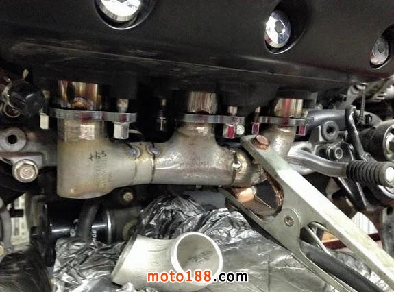 F6B 更換離合器片需要下發(fā)動機才能施工。由于大排摩托車改裝渦輪還是相對陌生的改裝方式,因此這次找來在四輪汽車上改裝渦輪經(jīng)驗相當(dāng)豐富的技師,通過對Gold Wing F6B 車輛構(gòu)造的了解與四輪改裝渦輪的經(jīng)驗,而打造出來。在渦輪改裝前,首先就是要找出渦輪的安裝位置,國外所改裝的渦輪Gold Wing 是將渦輪放在排氣中尾段位置,但因為該車改裝方式,連原本油箱都必須切掉用來跑進氣,因此這個位置不在改裝方案內(nèi)。最后渦輪選擇在前輪后方,原本喇叭的位置處,而喇叭則移到車體內(nèi)。為了搭配渦輪,排氣管也需要自行制作,原廠是左右各三根頭段往后至中段合而為一,再出口一分為二接到尾段。此車是將頭段一出來就合為一根,往前接至渦輪來推動葉片,等于將渦輪安放在頭段位置處。