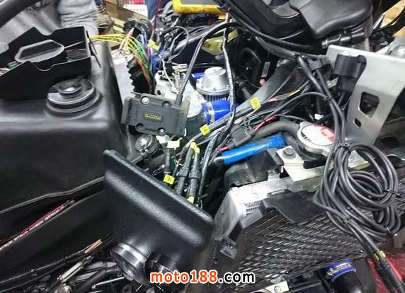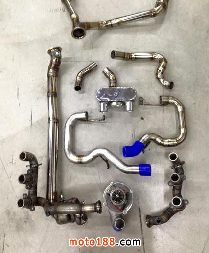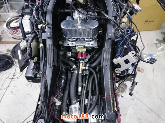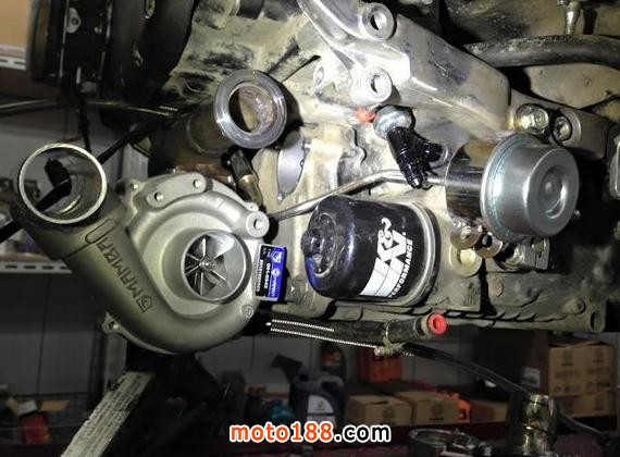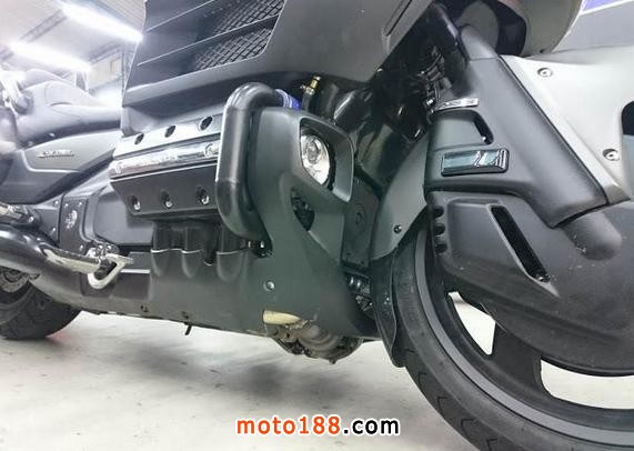 偽裝成防摔杠的進氣管。除了排氣與進氣外,渦輪增壓本身的水冷管路與機油管路也是另一項課題,雖然Gold Wing F6B 體積龐大,但盡量保持原廠的情況下,可利用空間也不多,不大可能再裝一個渦輪專用的冷卻水排。因為Gold Wing 的水冷排位在左右兩側(cè),因此在底下有一條連接兩個水冷排的泄水管,將這條管路廢除并連到渦輪水道,通過Gold Wing F6B 本身的冷卻水來冷卻。而這樣的改裝對后續(xù)保養(yǎng)來說,也只是從單一泄水螺絲來泄漏水箱水變成左右兩邊的水箱要分開泄水。渦輪的機油則是從發(fā)動機下方的油壓感知器位置,安裝一個三通管,拉出一條機油管路連接到渦輪內(nèi),而機油循環(huán)回發(fā)動機則是從機油注入孔導(dǎo)回。
