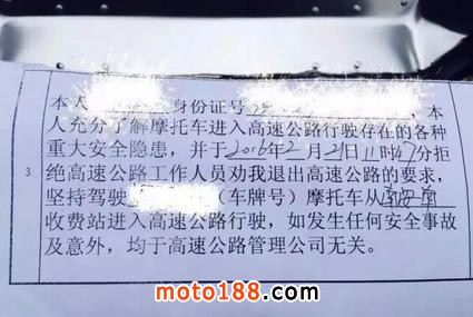 2016年2月21日中午時分,福建三明一車友在裝備齊整,證件檢查無誤后單人駕駛著自己的摩托車由南安南(路口)前往永安南(路口)。為爭取全國摩友合法上高速的權利以及驗證高速職權部門的“平等 真相 正義”(小編YY中),車友毅然決定:親自一探高速公路究竟。在【南安南】高速路口取卡 上路。此時,一路政人員前來詢問其取卡事由,在表明立場并據理力爭后,工作人員終拿出了如下圖所示的官方“免責聲明”,在車友確認簽字后給予放行,并收回高速繳費卡。