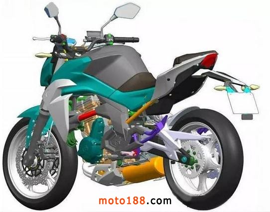 從專利圖我們能夠看出,400NK配備的是水冷并列雙缸發動機,雖然其代工的KTM 390 DUKE那款大單缸發動機有著不錯的動力性能,但是中國有很多摩友仿佛并不買賬。一來普遍認為震動較大,二來固有觀念認為多缸發動機動力更為強勁(事實證明這個想法是錯誤的)。此外,春風對并列雙缸發動機研究的已經很透徹了,完全沒有必要再去開發全新的發動機總成,所以通過合理改進,使用雙缸發動機才是王道。當然,春風也正是這么做的。