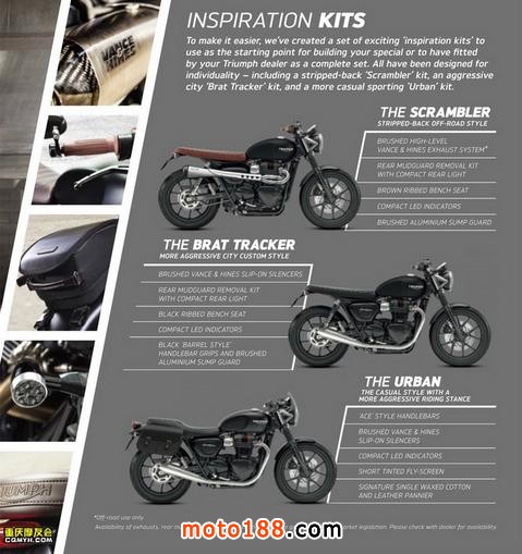 廠方提供三種不同風格的改裝套餐讓車主選擇,分別是Scrambler、Brat Tracker和Urban。三款套餐都提供了不同設計的Vance & Hinese死氣喉,轉向把手的角度和闊度也有不同。座位和尾泥擋的造型也有變化,讓Street Twin外型不會千篇一律,更有個性。