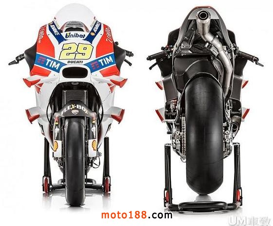 當地時間2月23日,MotoGP杜卡迪車隊發布了2016賽季全新戰車Desmo16 GP 。新車依然采用了紅、白、黑的顏色涂裝,而設計上最大的亮點在于車頭位置加裝了類似F1賽車上的擾流翼片,該翼片可以提供更強的下壓力,從而起到提升車速的目的,而這一點已經在2015賽季得到印證。2016賽季揭幕戰將于3月20日在卡塔爾的羅塞爾賽道打響,感興趣的車迷不要錯過喲。