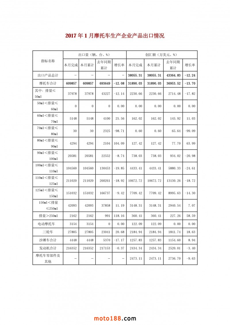 核心提示:2017年1月摩托車生產企業產品出口情況