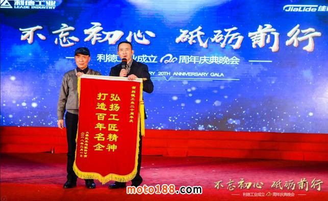 作為本次慶典唯一受邀的業內知名媒體《摩托車與配件》王建總經理不遠千里,遠道而來,慶賀利德工業成立20周年,向利德工業董事長贈送錦旗并發表賀詞。