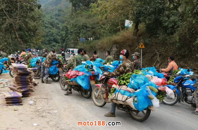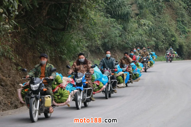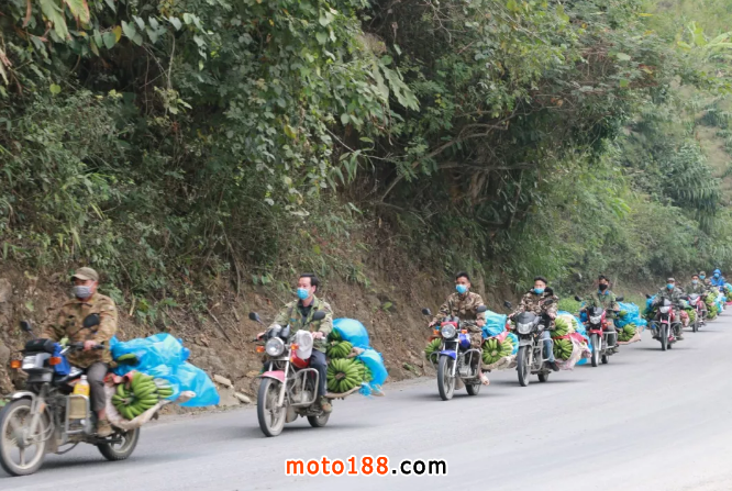核心提示:村民騎著摩托車把香蕉從村里載運(yùn)到公路上。本文圖片 劉恒 圖一段15秒的短視頻,浩浩蕩蕩的摩托車大軍載著村民向湖北捐贈(zèng)的物資,