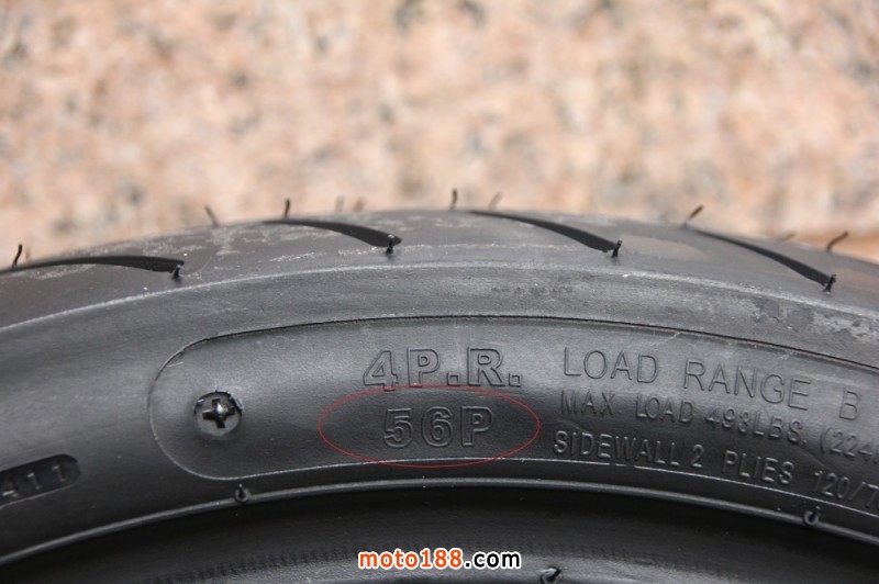 旁邊的一些參數(shù)也一起講一下,4P.R.表示輪胎體采用4層結(jié)構(gòu),層數(shù)越多、載重能力越強。MAX.LOAD 493LBS.(224kg)表示最大負載為224kg、 也可以理解為、承載重量為224kg。LOAD RANGE B,負荷等級為B級(和4P.R,4層結(jié)構(gòu)是一個意思)