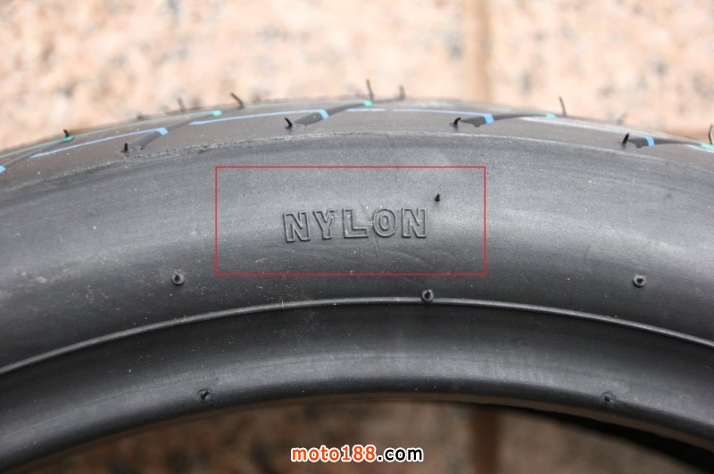 如圖所示,NYLON字母表示,該輪胎的胎面結(jié)構(gòu)為尼龍材質(zhì),有的稱為尼龍輪胎,輪胎的胎體簾布層、由數(shù)層掛膠簾布組成, 4P.R.代表的是采用4層簾線的結(jié)構(gòu)方式,當然層數(shù)越多載重能力越強,通常摩托車還有子午線輪胎可以選擇,也就是俗稱的鋼絲胎,胎體和帶束層是由多層鋼絲簾布組成,有著強度高,負載能力大的優(yōu)勢,子午線的輪胎用符號R表示。