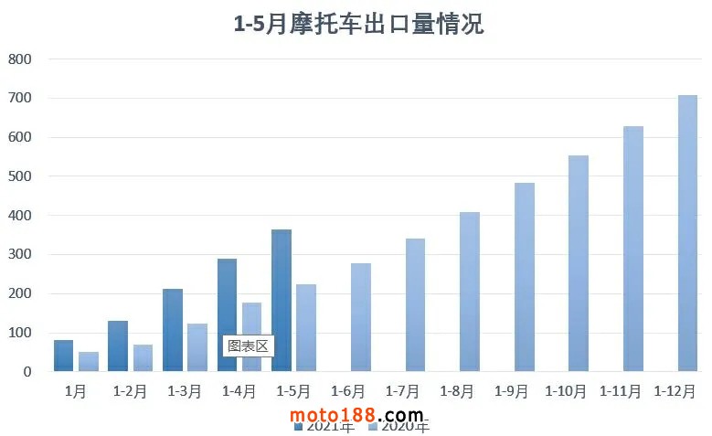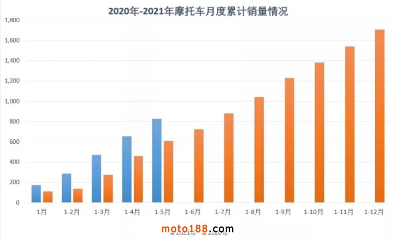 1-5月,全行業完成摩托車產銷824.92萬輛和825.67萬輛,同比增長37.23%和35.97%。其中,二輪摩托車產銷724.24萬輛和725.18萬輛,同比增長38.12%和36.82%;三輪摩托車產銷100.68萬輛和100.49萬輛,同比增長31.18%和30.14%。