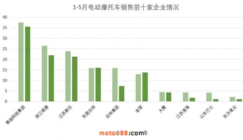 1-5月,電動摩托車銷售前十名企業(集團)為雅迪科技集團、浙江綠源、江蘇新日、東莞臺鈴、宗申集團、金翌、濟南大隆、江蘇淮海、山東巴士和東方凌云,分別銷售37.46萬輛、26.42萬輛、23.86萬輛、15.89萬輛、15.83萬輛、12.93萬、4.41萬輛、4.24萬輛、4.2萬輛和2.13萬輛。