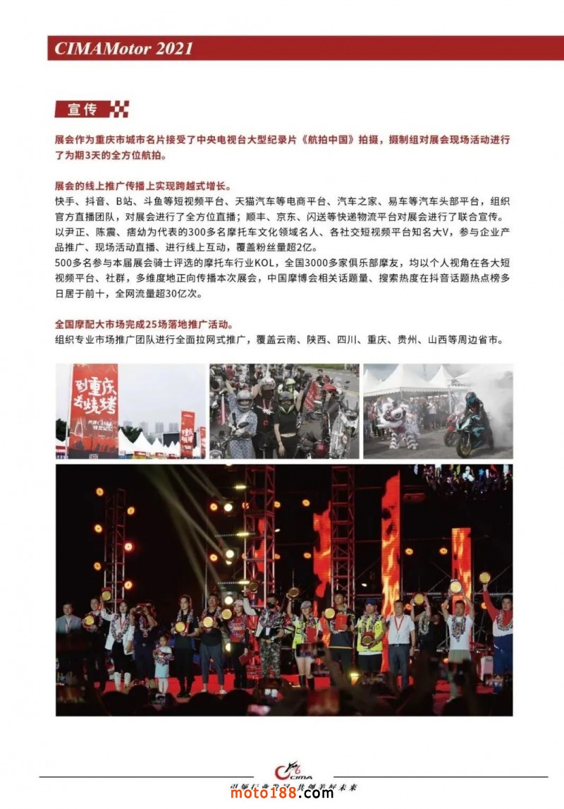 以騎摩托為代表的摩托車自媒體公眾號為信息源點,對摩博會進行信息傳播及活動互動。與快手、抖音、B站、斗魚等短視頻平臺,天貓汽車等電商平臺、汽車之家、易車等汽車頭部平臺,順豐、京東、閃送等快遞物流平臺建立平臺級深入合作,對展會進行聯合宣傳傳遞展會信息,直播摩博會現場活動、傳播機車文化。邀請國內外熱愛摩托車運動及文化的,一線演藝和運動明星、文化領域名人,參加中國摩博會,參與企業產品推廣、現場活動直播、進行線上互動,擴大展會活動全國影響力和輻射范圍。