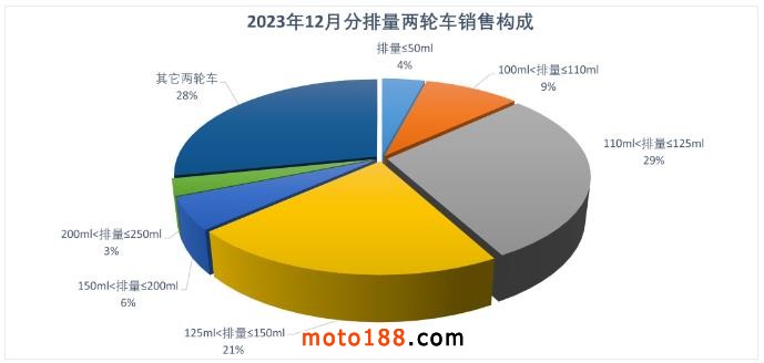 1-12月,50系列產銷66.18萬輛和67.66萬輛,同比增長21.52%和15.92%;110系列產銷150.52萬輛和151.01萬輛,產量同比增長2.41%,銷量同比下降0.69%;125系列產銷482.41萬輛和479.48萬輛,同比下降1.62%和2.82%;150系列產銷354.8萬輛和354.59萬輛,同比增長18.05%和17.64%;200系列產銷89.7萬輛和91.12萬輛,產銷量同比增長6.43%和5.75%;250系列產銷47.17萬輛和47.68萬輛,產銷量同比下降4.94%和2.94%。250cc以上大排量摩托車(不含250cc)產銷51.18萬輛和52.54萬輛,同比下降7.13%和5.06%。