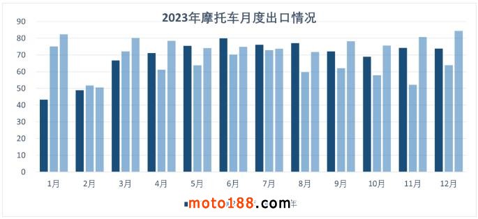12月,據中國摩托車商會統計,我國摩托車出口環比微降,同比增長明顯。全年,我國摩托車外貿出口運行平穩,月平均出口量在70萬輛左右,累計出口量超過830萬輛,同比增長明顯。