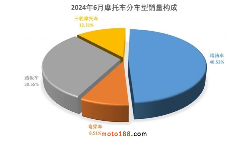 1-6月,跨騎車產(chǎn)銷464.78萬輛和461.75萬輛,同比增長(zhǎng)21.95%和20.03%;踏板車產(chǎn)銷285.3萬輛和291.71萬輛,同比下降34.55%和27.28%;彎梁車產(chǎn)銷82.53萬輛和81.03萬輛,同比增長(zhǎng)4.45%和2.82%。從各車型銷量占二輪車總銷量的比重看,跨騎、踏板和彎梁三類車型占比分別為55.33%、34.96%和9.71%。