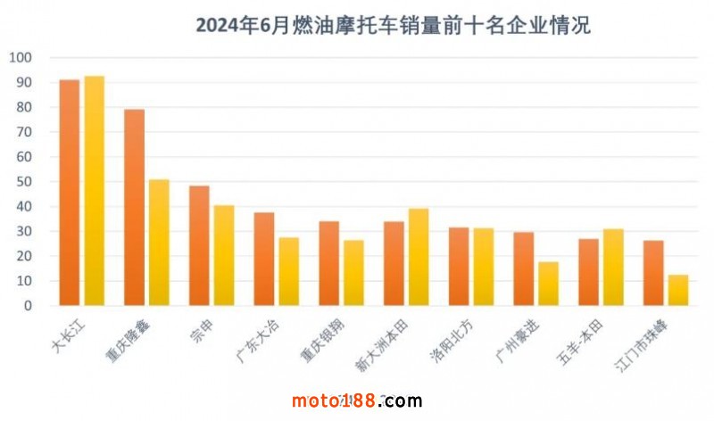 1-6月,燃油摩托車銷量前10名企業(yè)(集團(tuán))為大長(zhǎng)江、隆鑫、宗申、廣東大冶、重慶銀翔、新大洲本田、洛陽北方、廣州豪進(jìn)、五羊-本田、江門市珠峰,10家企業(yè)共銷售摩托車438.17萬輛,占摩托車總銷量的55.58%。