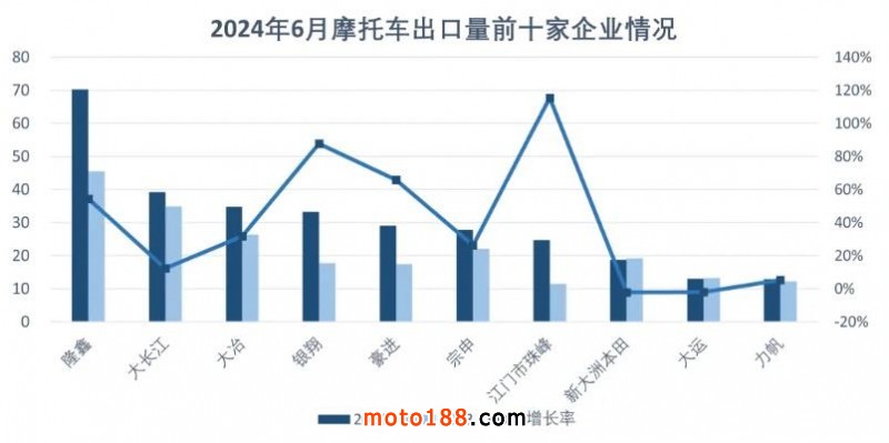 1-6月,摩托車出口量排名前十位的企業(yè)依次為:隆鑫、大長(zhǎng)江、廣東大冶、重慶銀翔、廣州豪進(jìn)、宗申、江門市珠峰、新大洲本田、大運(yùn)、力帆,上述十家企業(yè)共出口303.83萬輛,占摩托車出口總量的58.99%。