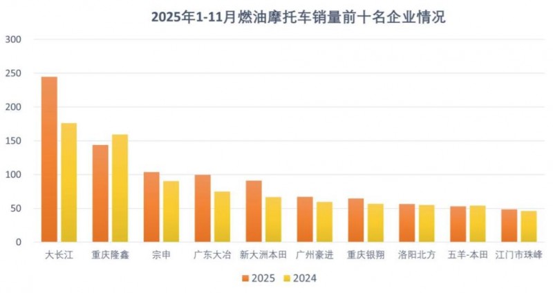 1-11月份,我國(guó)燃油摩托車銷量前十名的企業(yè)分別是:大長(zhǎng)江、隆鑫、宗申、廣東大冶、新大洲本田、廣州豪進(jìn)、重慶銀翔、洛陽(yáng)北方、五羊-本田、江門市珠峰。