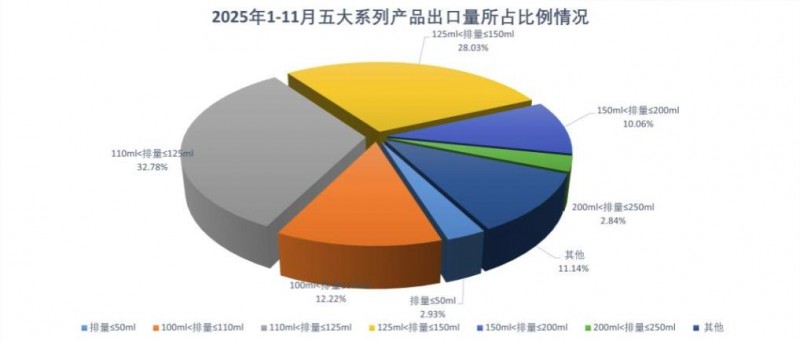 1-11月份,國(guó)產(chǎn)摩托車出口量位居前六位的系列品種分別是:125cc、150cc、110cc、200cc、50和250cc,從中可以看到小排量車型在海外市場(chǎng)更受歡迎,且呈現(xiàn)出了明顯的增長(zhǎng)勢(shì)頭。