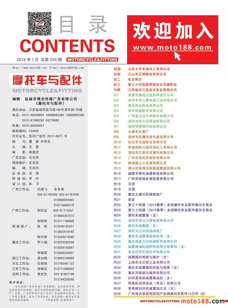 和這些歷經風雨在摩配行業堅守的同仁們一樣,我們也煉得自信與從容。新的一年我們雜志以全新的面貌出現,我們采用全彩色出刊,同時將我們的服務對象橫向延伸。與我們的同仁一樣,立足摩配,橫向拓展,內外兼修,努力做好雜志,除了提升外觀品相,更是注重在內容上的變化。每期雜志用十頁左右的文字來廣角掃描我們摩托車配件行業的子行業,這一期推出的是減震器專題。上一期化油器專題出刊以后,不光受到市場的歡迎,有些企業還把我們的雜志認真地收藏保存好,因為有不少信息對于他們的生產、經營都有一定幫助。對我們來說也是迫使我們更深入地了解摩配的各個子行業。自從前年摩托車行業開始強制提高排放標準以后,我們片面地認為化油器這個行業會被電噴完全取代,這個產業是不是已經步入到夕陽期?通過編排我們較深刻的對這一產業有所了解,制造之地一派欣欣向榮的景象,在我們摩托車業需求量減少之時,我們的制造廠已經在通機領域干得風生水起,有不少廠即使擴大產能也供不應求。當地地方政府也從這個產業得到許多實惠,一個雙贏的局面,這就是產業的正能量。其實市場如何變幻,總有一批做得好的龍頭企業在努力工作,打造自己的名牌,眼光不僅僅局限面前,更多地瞄準了國際市場。中國制造能漂洋過海,被國外消費者所接受,正是這樣一批行業精英為國家和民族在努力。