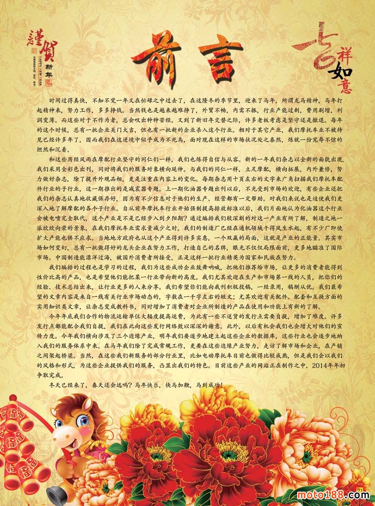 時間過得真快,不知不覺一年又在忙碌之中過去了,在這隆冬的季節里,迎來了馬年,所謂龍馬精神,馬年打起精神來,努力工作,多多掙錢。當然錢也是越來越難掙了,外貿不暢,內需不振,行業產能過剩,費用劇增,利潤變薄。而這些對于不作為者,總會嘆出種種苦經。又到了新舊年交替之際,許多老板考慮是堅守還是撤退。每年的這個時候,總有一批企業關門大吉,但也有一批新的企業殺入這個行業。相對于其它產業,我們摩托車業不被待見已經許多年了,因而我們在這逆境中似乎成為不死鳥,面對現在這樣的市場狀況處之泰然,煉就一份寵辱不驚的坦然和沉著。