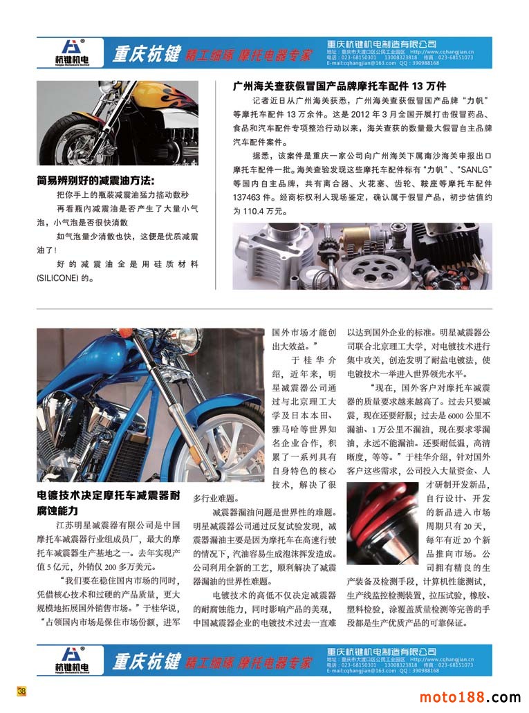 和這些歷經(jīng)風雨在摩配行業(yè)堅守的同仁們一樣,我們也煉得自信與從容。新的一年我們雜志以全新的面貌出現(xiàn),我們采用全彩色出刊,同時將我們的服務對象橫向延伸。與我們的同仁一樣,立足摩配,橫向拓展,內(nèi)外兼修,努力做好雜志,除了提升外觀品相,更是注重在內(nèi)容上的變化。每期雜志用十頁左右的文字來廣角掃描我們摩托車配件行業(yè)的子行業(yè),這一期推出的是減震器專題。上一期化油器專題出刊以后,不光受到市場的歡迎,有些企業(yè)還把我們的雜志認真地收藏保存好,因為有不少信息對于他們的生產(chǎn)、經(jīng)營都有一定幫助。對我們來說也是迫使我們更深入地了解摩配的各個子行業(yè)。自從前年摩托車行業(yè)開始強制提高排放標準以后,我們片面地認為化油器這個行業(yè)會被電噴完全取代,這個產(chǎn)業(yè)是不是已經(jīng)步入到夕陽期?通過編排我們較深刻的對這一產(chǎn)業(yè)有所了解,制造之地一派欣欣向榮的景象,在我們摩托車業(yè)需求量減少之時,我們的制造廠已經(jīng)在通機領域干得風生水起,有不少廠即使擴大產(chǎn)能也供不應求。當?shù)氐胤秸矎倪@個產(chǎn)業(yè)得到許多實惠,一個雙贏的局面,這就是產(chǎn)業(yè)的正能量。其實市場如何變幻,總有一批做得好的龍頭企業(yè)在努力工作,打造自己的名牌,眼光不僅僅局限面前,更多地瞄準了國際市場。中國制造能漂洋過海,被國外消費者所接受,正是這樣一批行業(yè)精英為國家和民族在努力。
