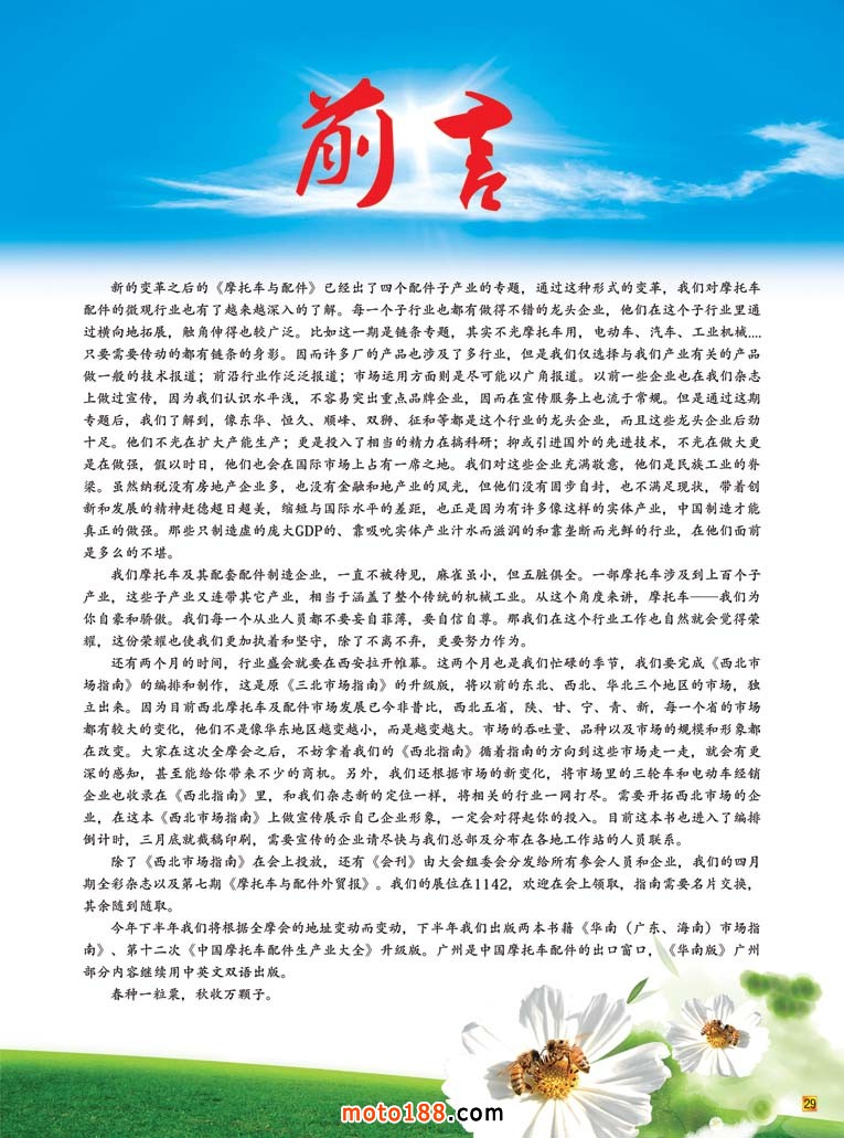 除了《西北市場指南》在會上投放,還有《會刊》由大會組委會分發(fā)給所有參會人員和企業(yè),我們的四月期全彩雜志以及第七期《摩托車與配件外貿(mào)報》。我們的展位在1142,歡迎在會上領(lǐng)取,指南需要名片交換,其余隨到隨取。