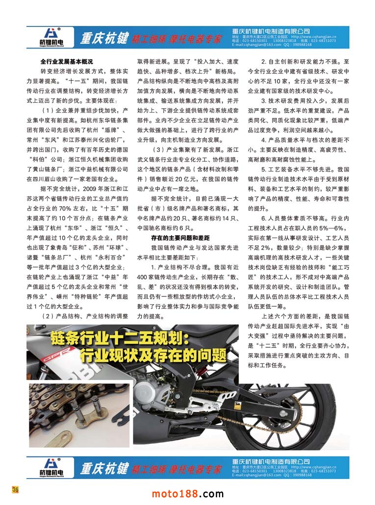新的變革之后的《摩托車與配件》已經出了四個配件子產業的專題,通過這種形式的變革,我們對摩托車配件的微觀行業也有了越來越深入的了解。每一個子行業也都有做得不錯的龍頭企業,他們在這個子行業里通過橫向地拓展,觸角伸得也較廣泛。比如這一期是鏈條專題,其實不光摩托車用,電動車、汽車、工業機械....只要需要傳動的都有鏈條的身影。因而許多廠的產品也涉及了多行業,但是我們僅選擇與我們產業有關的產品做一般的技術報道;前沿行業作泛泛報道;市場運用方面則是盡可能以廣角報道。以前一些企業也在我們雜志上做過宣傳,因為我們認識水平淺,不容易突出重點品牌企業,因而在宣傳服務上也流于常規。但是通過這期專題后,我們了解到,像東華、恒久、順峰、雙獅、征和等都是這個行業的龍頭企業,而且這些龍頭企業后勁十足。他們不光在擴大產能生產;更是投入了相當的精力在搞科研;抑或引進國外的先進技術,不光在做大更是在做強,假以時日,他們也會在國際市場上占有一席之地。我們對這些企業充滿敬意,他們是民族工業的脊梁。雖然納稅沒有房地產企業多,也沒有金融和地產業的風光,但他們沒有固步自封,也不滿足現狀,帶著創新和發展的精神趕德超日超美,縮短與國際水平的差距,也正是因為有許多像這樣的實體產業,中國制造才能真正的做強。那些只制造虛的龐大GDP的、靠吸吮實體產業汁水而滋潤的和靠壟斷而光鮮的行業,在他們面前是多么的不堪。