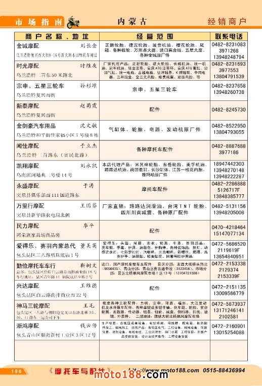 歷時半年,橫跨十三省市的《北方市場指南》今天終于成書,奉獻給行業企業,這本書是我們《中國摩托車配件市場指南》的第三個分冊,也是工作量和難度最大的一本書,為了資料的準確,我們雜志社全體內部工作人員,在炎熱的夏季里,孜孜不倦地工作,先后冒著酷暑兵分三 路去西北、華北、東北的省份,由于夏季暑運高峰,交通也十分不便,有時為了趕路,甚至乘了三十多個小時無空調的大巴車。今天看到這本混合我們汗水和心血的《北方市場指南》我們感覺這份果實更加不同尋常,彌加珍貴。