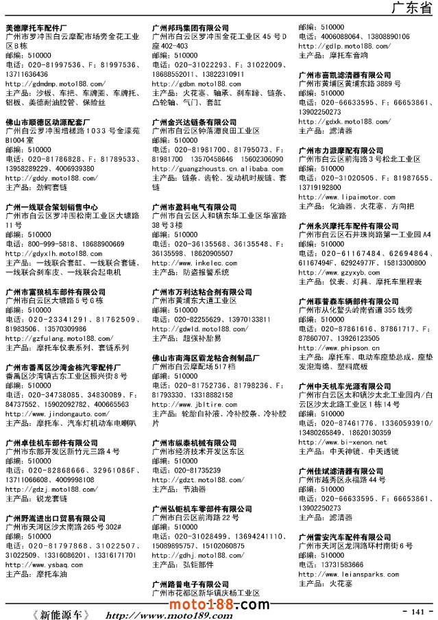 這兩年行業(yè)調(diào)整力度非常大,為了確保我們提供的信息準確性,我們本著寧缺毋濫的原則,不去圖虛的數(shù)量。目前摩托車與配件行業(yè)的不少經(jīng)銷商是跨行業(yè)經(jīng)營的,所以我們在本書中增加了部分摩托車整車廠、電動車生產(chǎn)廠、機動三輪車制造廠。所選的這些企業(yè)都是這個行業(yè)具有影響力的品牌企業(yè),是為了大家在使用這本書時,獲取相關(guān)的延伸產(chǎn)業(yè)更多的實用信息。