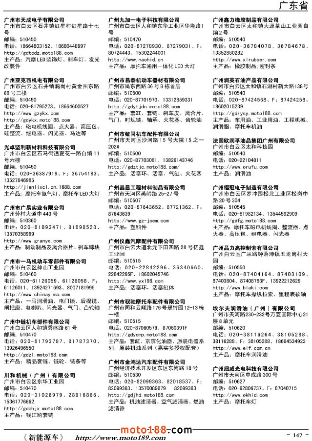 這兩年行業調整力度非常大,為了確保我們提供的信息準確性,我們本著寧缺毋濫的原則,不去圖虛的數量。目前摩托車與配件行業的不少經銷商是跨行業經營的,所以我們在本書中增加了部分摩托車整車廠、電動車生產廠、機動三輪車制造廠。所選的這些企業都是這個行業具有影響力的品牌企業,是為了大家在使用這本書時,獲取相關的延伸產業更多的實用信息。