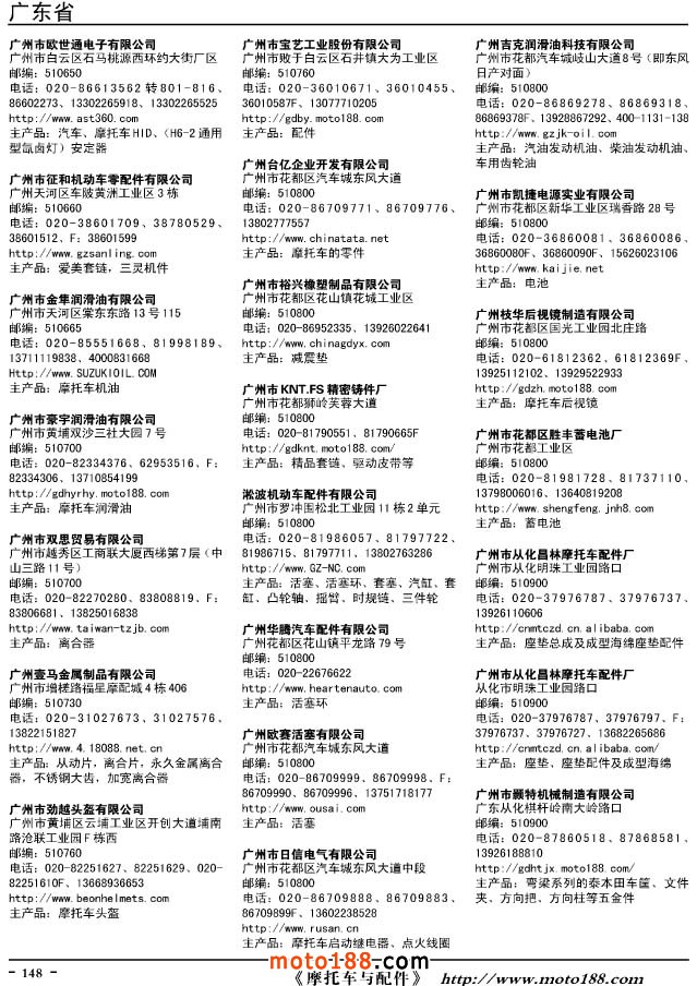 這兩年行業調整力度非常大,為了確保我們提供的信息準確性,我們本著寧缺毋濫的原則,不去圖虛的數量。目前摩托車與配件行業的不少經銷商是跨行業經營的,所以我們在本書中增加了部分摩托車整車廠、電動車生產廠、機動三輪車制造廠。所選的這些企業都是這個行業具有影響力的品牌企業,是為了大家在使用這本書時,獲取相關的延伸產業更多的實用信息。