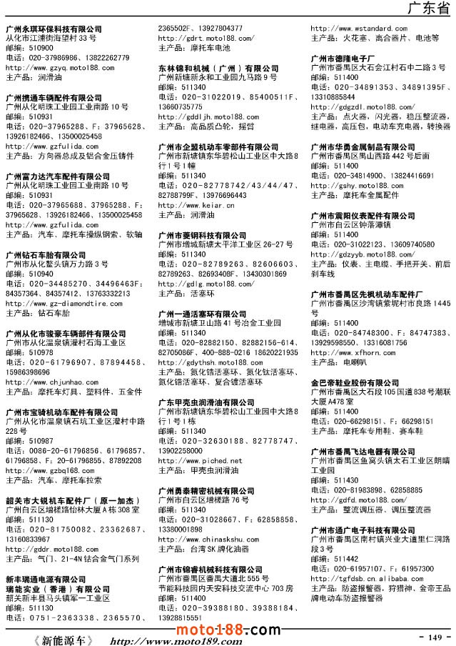 這兩年行業調整力度非常大,為了確保我們提供的信息準確性,我們本著寧缺毋濫的原則,不去圖虛的數量。目前摩托車與配件行業的不少經銷商是跨行業經營的,所以我們在本書中增加了部分摩托車整車廠、電動車生產廠、機動三輪車制造廠。所選的這些企業都是這個行業具有影響力的品牌企業,是為了大家在使用這本書時,獲取相關的延伸產業更多的實用信息。