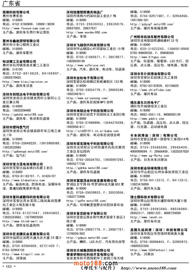 這兩年行業調整力度非常大,為了確保我們提供的信息準確性,我們本著寧缺毋濫的原則,不去圖虛的數量。目前摩托車與配件行業的不少經銷商是跨行業經營的,所以我們在本書中增加了部分摩托車整車廠、電動車生產廠、機動三輪車制造廠。所選的這些企業都是這個行業具有影響力的品牌企業,是為了大家在使用這本書時,獲取相關的延伸產業更多的實用信息。