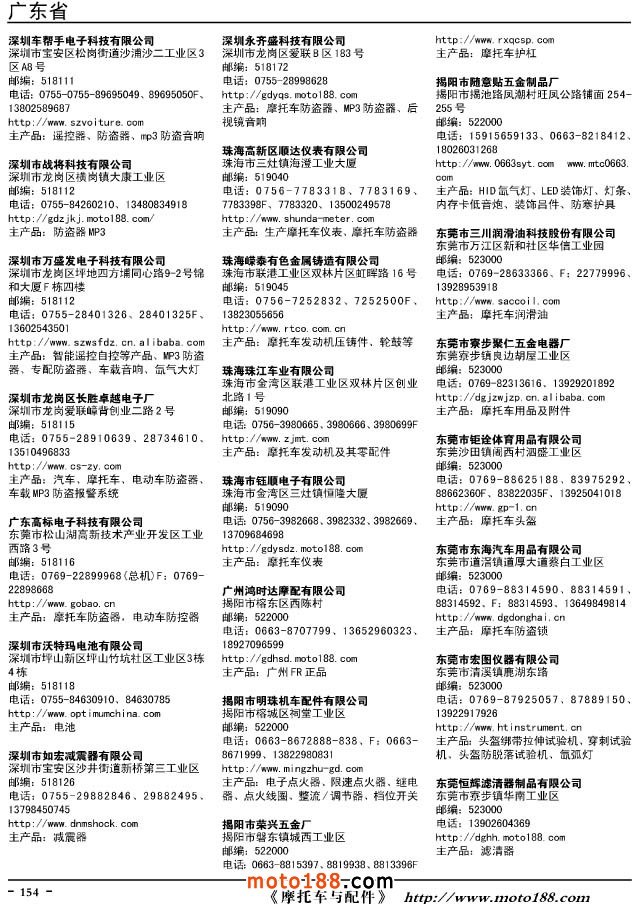 這兩年行業(yè)調(diào)整力度非常大,為了確保我們提供的信息準確性,我們本著寧缺毋濫的原則,不去圖虛的數(shù)量。目前摩托車與配件行業(yè)的不少經(jīng)銷商是跨行業(yè)經(jīng)營的,所以我們在本書中增加了部分摩托車整車廠、電動車生產(chǎn)廠、機動三輪車制造廠。所選的這些企業(yè)都是這個行業(yè)具有影響力的品牌企業(yè),是為了大家在使用這本書時,獲取相關(guān)的延伸產(chǎn)業(yè)更多的實用信息。