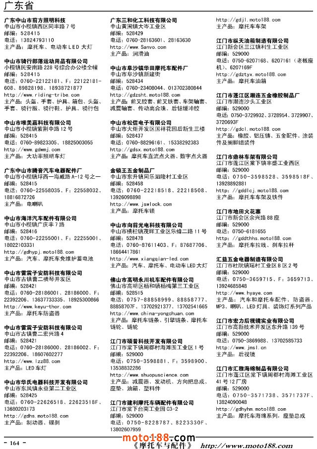 這兩年行業調整力度非常大,為了確保我們提供的信息準確性,我們本著寧缺毋濫的原則,不去圖虛的數量。目前摩托車與配件行業的不少經銷商是跨行業經營的,所以我們在本書中增加了部分摩托車整車廠、電動車生產廠、機動三輪車制造廠。所選的這些企業都是這個行業具有影響力的品牌企業,是為了大家在使用這本書時,獲取相關的延伸產業更多的實用信息。