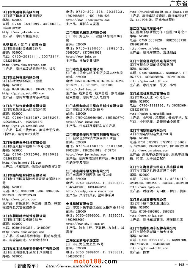 這兩年行業(yè)調(diào)整力度非常大,為了確保我們提供的信息準(zhǔn)確性,我們本著寧缺毋濫的原則,不去圖虛的數(shù)量。目前摩托車與配件行業(yè)的不少經(jīng)銷商是跨行業(yè)經(jīng)營的,所以我們在本書中增加了部分摩托車整車廠、電動車生產(chǎn)廠、機(jī)動三輪車制造廠。所選的這些企業(yè)都是這個行業(yè)具有影響力的品牌企業(yè),是為了大家在使用這本書時,獲取相關(guān)的延伸產(chǎn)業(yè)更多的實(shí)用信息。