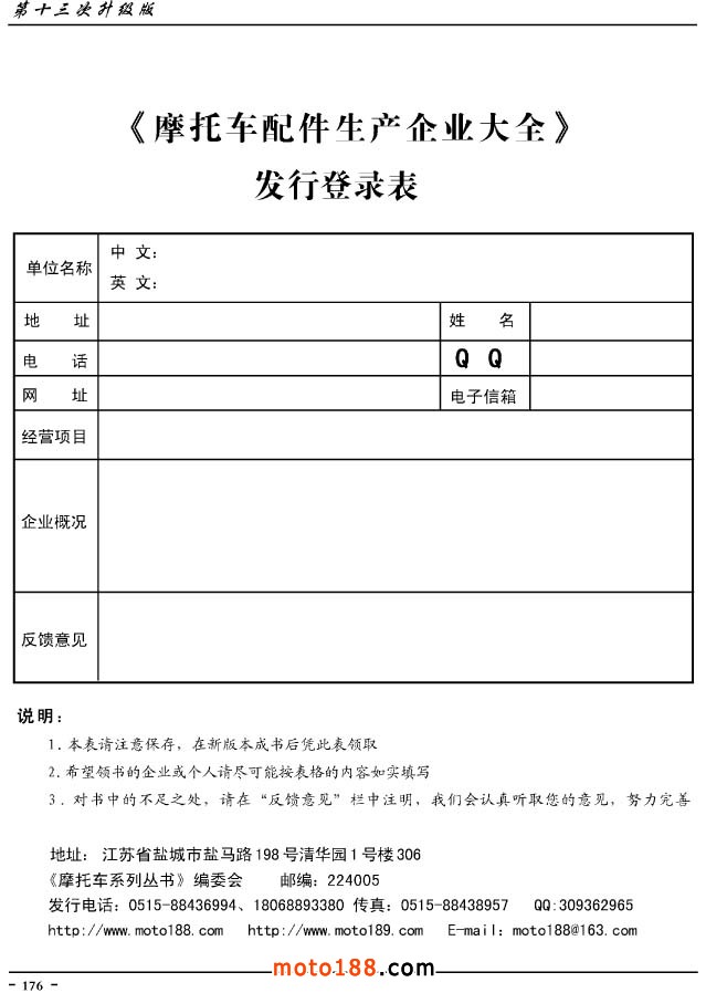 這兩年行業(yè)調(diào)整力度非常大,為了確保我們提供的信息準(zhǔn)確性,我們本著寧缺毋濫的原則,不去圖虛的數(shù)量。目前摩托車與配件行業(yè)的不少經(jīng)銷商是跨行業(yè)經(jīng)營(yíng)的,所以我們?cè)诒緯性黾恿瞬糠帜ν熊囌噺S、電動(dòng)車生產(chǎn)廠、機(jī)動(dòng)三輪車制造廠。所選的這些企業(yè)都是這個(gè)行業(yè)具有影響力的品牌企業(yè),是為了大家在使用這本書時(shí),獲取相關(guān)的延伸產(chǎn)業(yè)更多的實(shí)用信息。